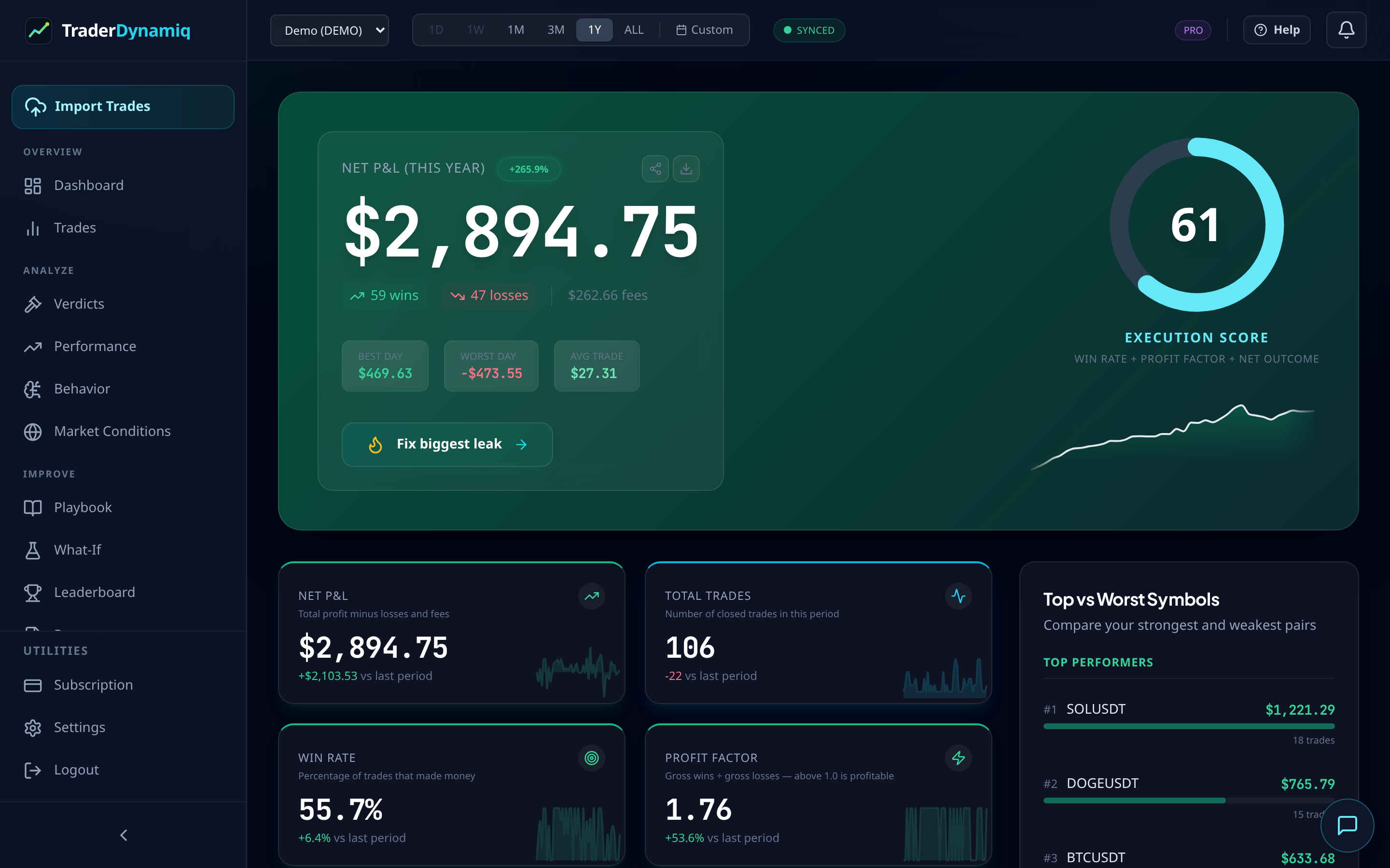 After importing your Deribit trades, Trader Dynamiq analyzes your execution history to find costly behavior patterns, track rule compliance, and measure whether your trading discipline is improving over time.